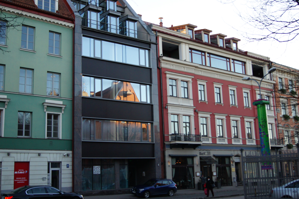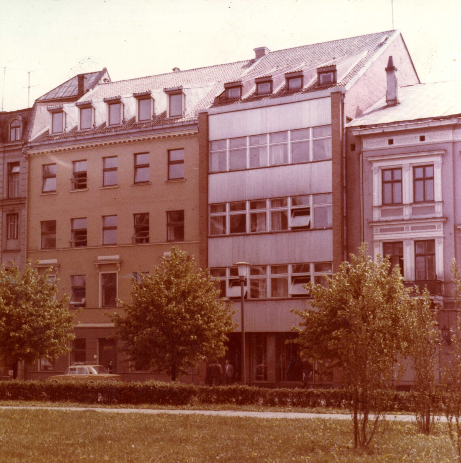 In the late sixties, the plot of land was handed over to an influential construction organisation called “Latvmezhkolhozstroy” (later “Latvagropromstroy”), and in 1978, a building designed by two architects named Ilmārs Paegle and Boris Ozols was erected and still stands. It won the praise of the professional community as one of the few buildings that has been designed and built in perfect harmony with the architectural ensemble of the Old Town while displaying novelty, namely the use of aluminum for the exterior trim.